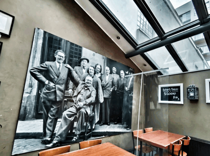 在咖啡馆旁边的橱窗中,挂着一张放大的老照片,照片中是一群站在咖啡馆门口的艺术家和作家,其中就包括从右边数第二个的 勒内·马格里特(René Magritte)。